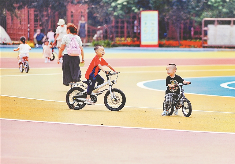 公園內(nèi)4000多平方米的休閑廣場,經(jīng)過改造、彩化,呈現(xiàn)出全新的面貌,孩子們在上面騎車、奔跑。彩色廣場將工業(yè)主題元素融入設(shè)計理念,與周圍的景觀小品相得益彰。