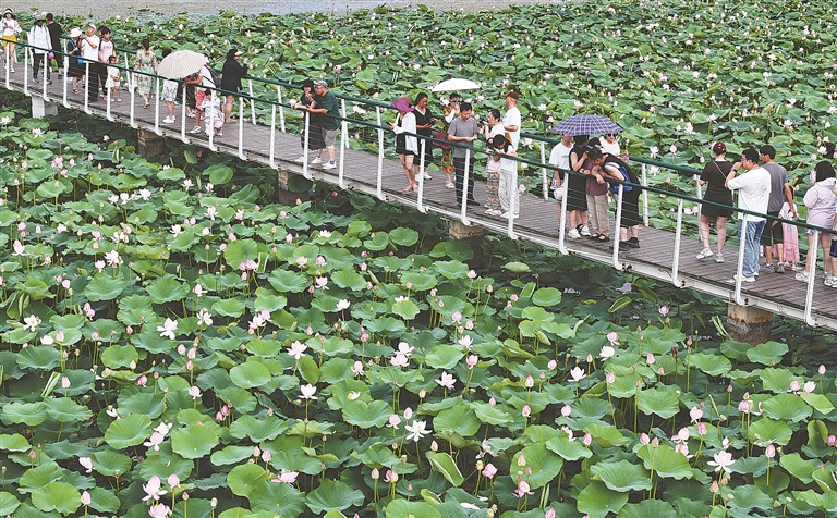近日,哈爾濱文化中心濕地公園內荷花綻放,吐露出它們的花苞,風過荷塘帶來陣陣荷香,荷葉上的露水滴落,發(fā)出清脆的聲音,整個荷花池塘展現(xiàn)出夏天獨有的生機。這滿塘的荷花爭奇斗艷,吸引眾多游客、市民前來賞花打卡。數(shù)條觀光棧道延伸至濕地深處,人們走在棧道上,近距離觀看野鴨子、白骨頂雞等野生鳥類,與蘆葦、荷花等水生植物親密接觸。
