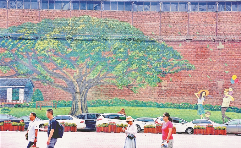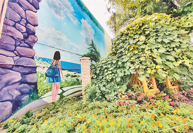 哈爾濱市道外區(qū)東直路上,路邊的花卉景觀與墻體彩繪互相映襯,成為街頭一道美麗風景,引得人們紛紛駐足觀看。畫里的溪流、小徑、樹木、花草、動物與畫外的綠地巧妙結(jié)合起來,融為一個整體,創(chuàng)意新穎,視覺效果良好,讓人眼前一亮。