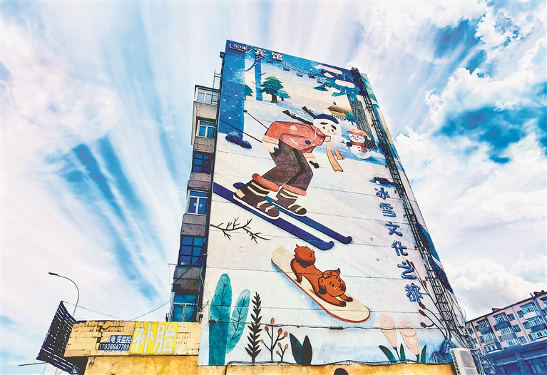 道外區(qū)火車頭街附近,一棟7層樓的外墻上繪制了滑雪運動的場景,吸引許多路人觀看;北馬路附近,一棟老樓的紅磚外墻也進行了彩繪,巨大的圖畫為當?shù)卦鎏砹艘坏烂谰啊?/span>本報記者 蘇強攝
