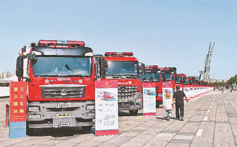 此次裝備觀摩活動主題為“促進(jìn)消防裝備技術(shù)交流,提升滅火救援專業(yè)能力”。觀摩區(qū)面積約20000平方米,分為消防車輛區(qū)和消防裝備區(qū)兩個部分,共計陳列消防車35種、36輛,器材119 種、200 余件套。其中,消防車輛觀摩區(qū)劃分為滅火類消防車、專勤類消防車、后援類消防車、通信類消防車和舉高類消防車五個部分,主要由水罐消防車、遠(yuǎn)程供水系統(tǒng)、搶險救援消防車、照明消防車、飲食保障車、通信指揮車、70米舉高噴射消防車、54米登高平臺消防車等組成。
