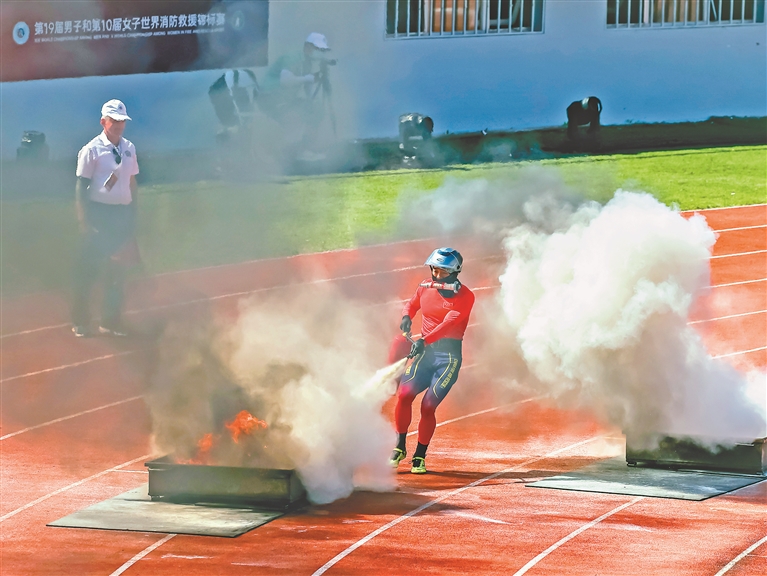本報9日訊(記者蔡韜)9日上午,在世界消防救援錦標(biāo)賽男子消防4×100米接力比賽中,中國隊跑出55秒62的好成績,獲得第一名。