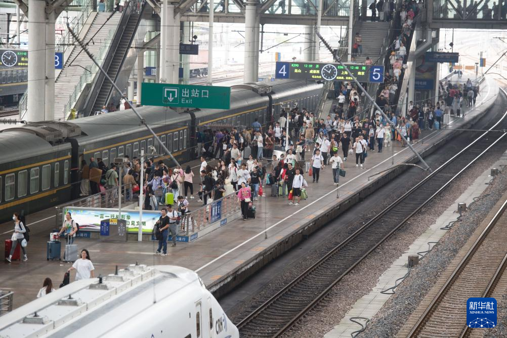 9月30日,旅客在南京火車站站臺(tái)乘車。新華社發(fā)(楊素平攝)