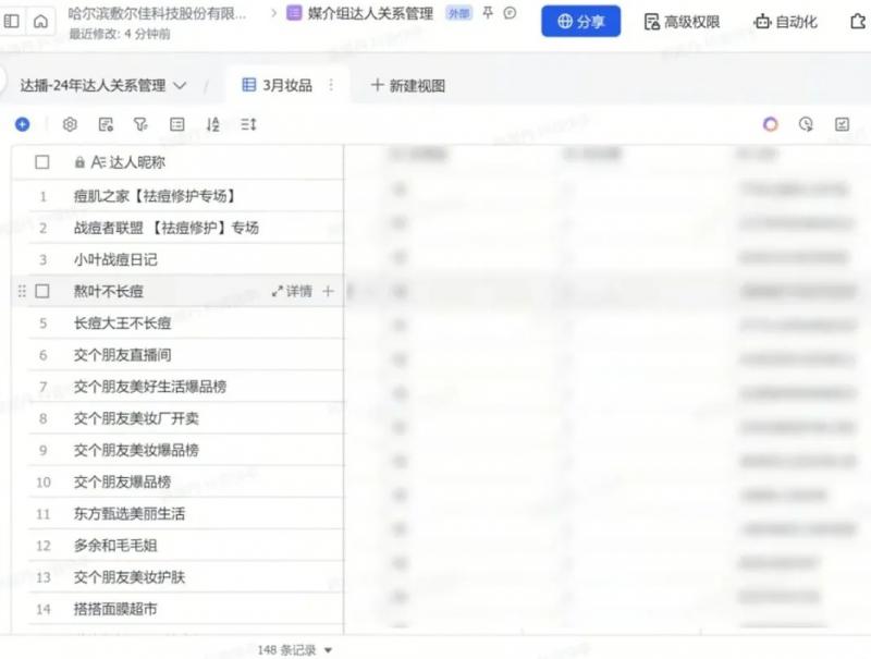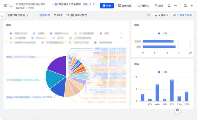 由于器械字號產品的特殊性,現(xiàn)在敷爾佳通過飛書在線文檔審批達人,將達人數(shù)據(jù)填寫上報,上級在線同步審批達人,跟進確定合作。直播中,用飛書云盤儲存資料,將達播錄屏,產品資料等數(shù)據(jù),同步云盤,方便各部門查看,調取相關資料。直播后,利用飛書多維表格將達人信息,合作傭金,產出 GMV,對接人等重要信息歸攏一起,形成多維表格方便組織內互相查閱填寫, 通過儀表盤的功能體現(xiàn)出哪些達人是優(yōu)質合作達人,并為二次投放合作提供了參考價值。