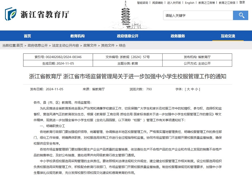 作為服裝產(chǎn)業(yè)發(fā)達省份,浙江省一直注重校服質(zhì)量。如2014年浙江省教育廳聯(lián)合浙江省質(zhì)量技術(shù)監(jiān)督局發(fā)布《關(guān)于進一步加強學生服裝和床上用品管理工作的通知》;2018年,浙江省質(zhì)監(jiān)局聯(lián)合教育廳、工商局聯(lián)合發(fā)布了《浙江省學生服質(zhì)量提升行動工作方案》;2022年10月,浙江省《教育收費政策(2022年)》規(guī)定學校收取服務(wù)性收費和代收費,堅持學生自愿和非營利原則,不得與學費、住宿費合并統(tǒng)一收取,不得從中牟利。