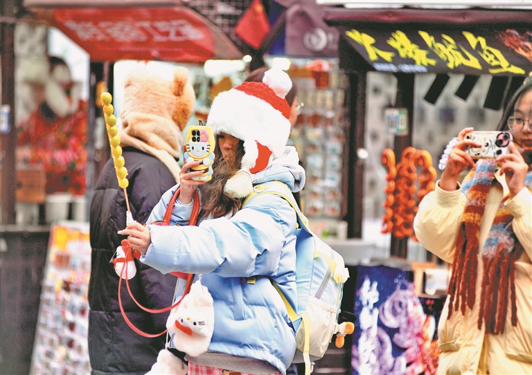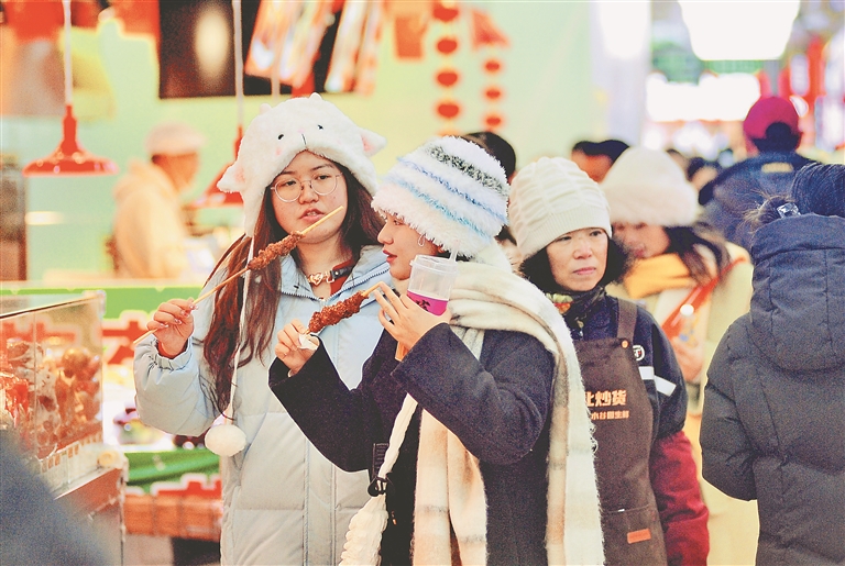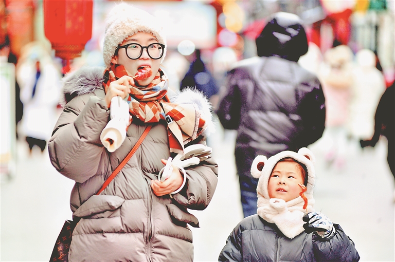 12月1日,哈爾濱市道外區(qū)南二道街附近,許多游客購(gòu)買(mǎi)、品嘗美味的糖葫蘆。這些糖葫蘆有很多口味,包括山楂、葡萄、菠蘿、大棗、桔子、草莓等,有的還在里面添加了糯米、核桃等餡料。冬天,吃一串晶瑩剔透、甜里帶酸的糖葫蘆,絕對(duì)是一種享受。