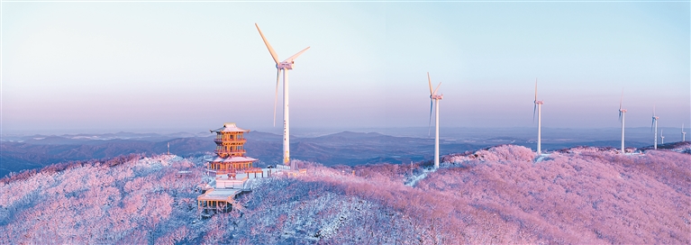 山林間云霧彌漫,白雪和蒼勁的虬枝映襯,山頂?shù)奶煊娱w和一個個白色巨人般的發(fā)電“風車”相映成趣,將這座名山裝扮得更加素雅、更顯活力。近處,松柏全都凝霜掛雪,戴銀披玉。山頂原始次森林中,低矮的灌木叢也被積雪覆蓋,成為了一朵朵五彩的冰花。高大的樹木被輕盈的雪花點綴,晶瑩剔透,仿若玉樹瓊枝,隨風搖擺,宛如仙境。