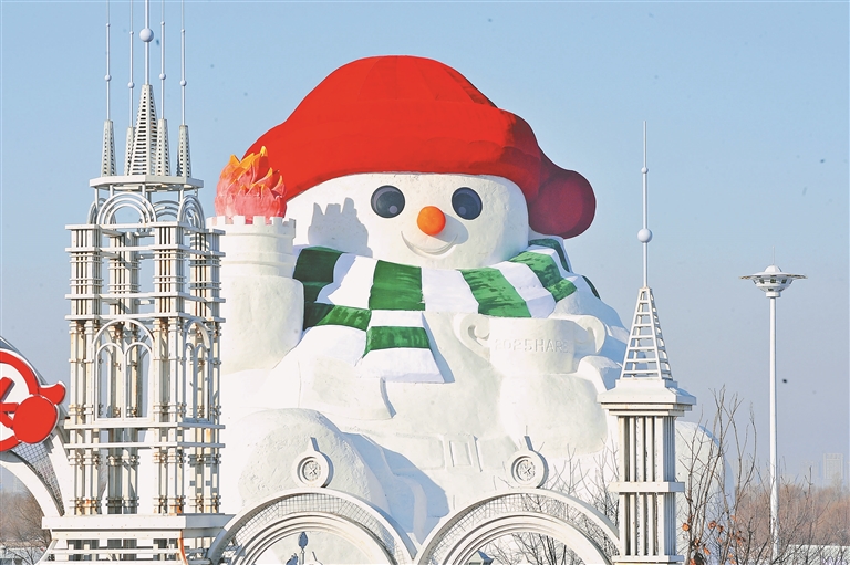 近日,哈爾濱市道里區(qū)群力江畔雪人碼頭,23米高的大雪人主體已經(jīng)完成,工人正在進行收尾工作。這座大雪人頭戴紅帽子,圍著白綠相間的圍脖,手里舉著火炬,十分可愛,吸引了許多游客和市民前來觀看。