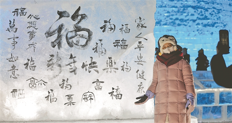 1月16日,為喜迎乙巳蛇年的到來(lái),哈爾濱冰雪大世界在園區(qū)打造一座許愿冰墻,上面寫滿各種祝福,為新年增添喜氣。本報(bào)記者 張澍攝