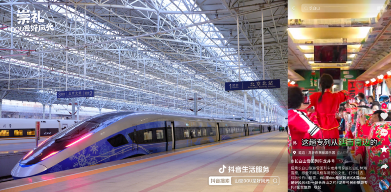 在線下,活動(dòng)還聯(lián)動(dòng)崇禮區(qū)政府、延邊州商務(wù)局、齊齊哈爾網(wǎng)信辦落地雪國專列,覆蓋復(fù)興號、民俗專列、高鐵站等不同場景,讓游客和市民感受濃濃冰雪氛圍,自發(fā)為當(dāng)?shù)匚穆梅N草,吸引更多雪友來到小城看見好風(fēng)光。截至活動(dòng)收官,“開往崇禮站的雪國專列”熱度達(dá)827萬,一度登上抖音河北多地同城榜TOP1。