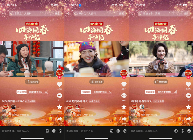 為紀念首個“非遺版春節(jié)”,由抖音出品、中國名酒劍南春冠名的春節(jié)主題紀錄片《四海同春年味紀》邀請多位明星來到家鄉(xiāng)或向往的城市,體驗當地特色年味。紀錄片于1月22日-1月27日,通過抖音、抖音精選、今日頭條、西瓜視頻、鮮時光等平臺播出。截至收官,該片正片播放量超1億,抖音話題播放量破2.3億,全網曝光達10億,相關話題多次登上平臺熱榜。
