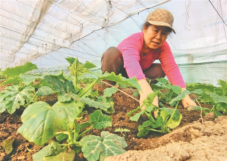 近日,哈爾濱市道里區(qū)新發(fā)鎮(zhèn)五星村的大棚里,菜農王秀梅正為黃瓜苗松土。王秀梅說,這些黃瓜苗在十天前移栽到了大棚里,長勢非常好。她家種了兩個棚的黃瓜,能產出3萬斤左右,預計在“五一”后采摘上市。