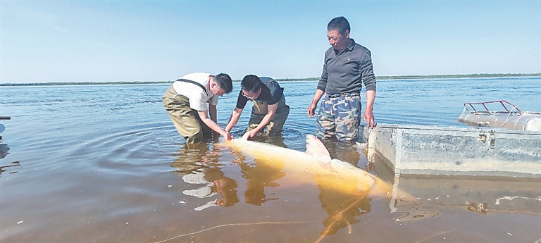 在黑龍江省水生動物資源養(yǎng)護(hù)中心技術(shù)人員的精心救治與蘿北縣和遜克縣漁政部門的協(xié)同努力下,這兩尾達(dá)氏鰉完成救治后,被及時放歸黑龍江干流蘿北段、遜克段,重歸自然。