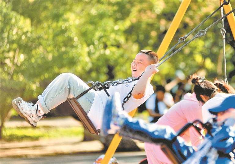 在省森林植物園內(nèi),孩子們在草坪上放風(fēng)箏、吹泡泡、追逐嬉戲,盡情享受假日好時光。