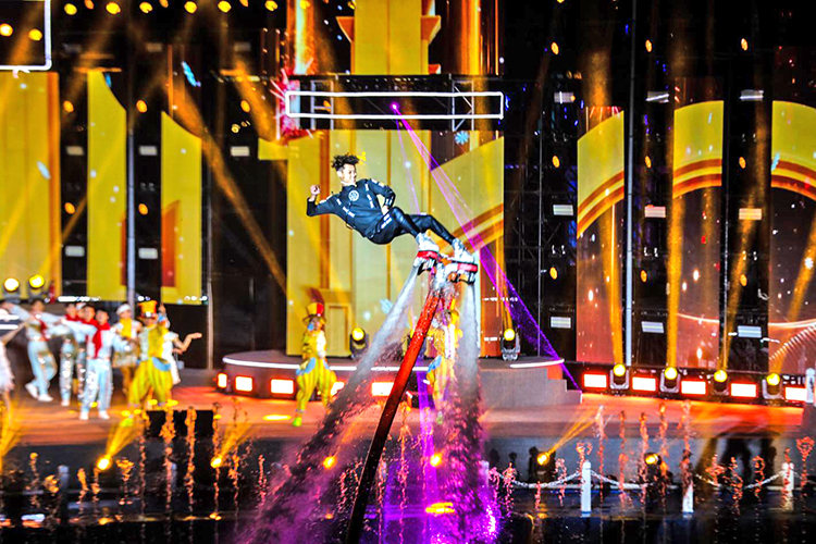夜幕降臨,松花江江面瞬間化作光影的畫布。彩排現(xiàn)場,水幕、噴泉、激光秀、無人機等特效輪番登場,交相輝映;光影與旋律交織,歷史故事通過鮮活的影像在觀眾眼前徐徐展開。演員們精湛的表演,配合著“人、聲、光、水、電、影、景”的深度融合,讓整個演出現(xiàn)場充滿了震撼力與感染力。