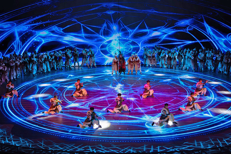 全新的演出以游戲玩家視角展開,當(dāng)游戲開始,巨大的環(huán)形地幕瞬間點(diǎn)亮,蒼茫的北境雪原鋪展開來,激光投影在穹頂交織出流動(dòng)的光幕,與升騰的煙霧交融,千年前的部落場(chǎng)景躍然眼前。