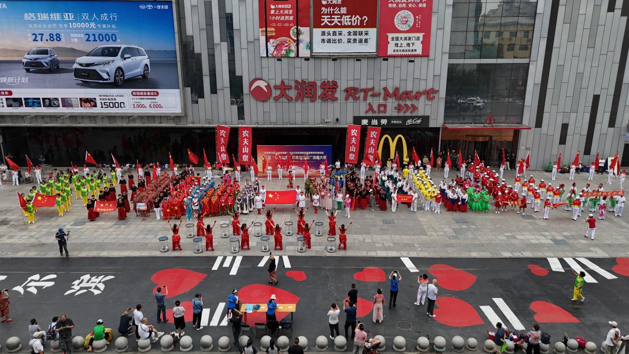 30人鼓樂團方陣,精神飽滿閃亮登場,瞬間點燃現(xiàn)場氣氛;隨后身穿紅色T恤的百人舞團,臺上臺下同跳《丁香花》,優(yōu)美舞姿展現(xiàn)出濃郁地域文化特色……