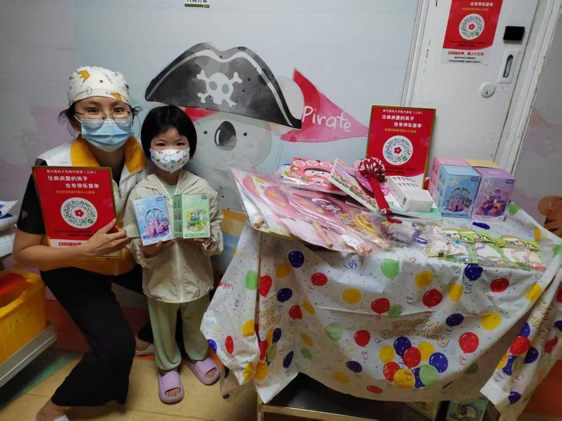 圖片說(shuō)明:在南方醫(yī)科大學(xué)南方醫(yī)院,志愿者和小朋友們一起開(kāi)展愛(ài)心義賣(mài)