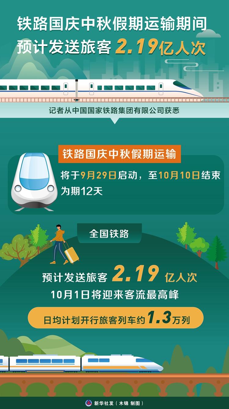 新華社北京9月28日電(記者樊曦)記者從中國國家鐵路集團有限公司獲悉,鐵路國慶中秋假期運輸將于9月29日啟動,至10月10日結(jié)束,為期12天,全國鐵路預(yù)計發(fā)送旅客2.19億人次,10月1日將迎來客流最高峰,日均計劃開行旅客列車約1.3萬列。