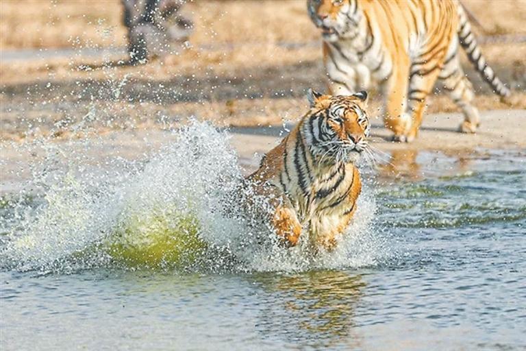 為提高游客觀賞體驗,園區(qū)通過工作車、無人機(jī)等多種方式,引導(dǎo)東北虎進(jìn)行水中捕食等,激發(fā)東北虎的野性與活力的同時,為游客呈現(xiàn)一場真實、震撼的視覺盛宴。
