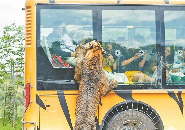在驚險觀光車上,游客可以通過特制裝置給成年虎投喂食物,體驗“虎口投食”的刺激?!皬膩頉]想過能這么近距離接觸東北虎,看著它從我手中的夾子吃肉,既緊張又激動!”來自上海的大學(xué)生語氣難掩興奮。