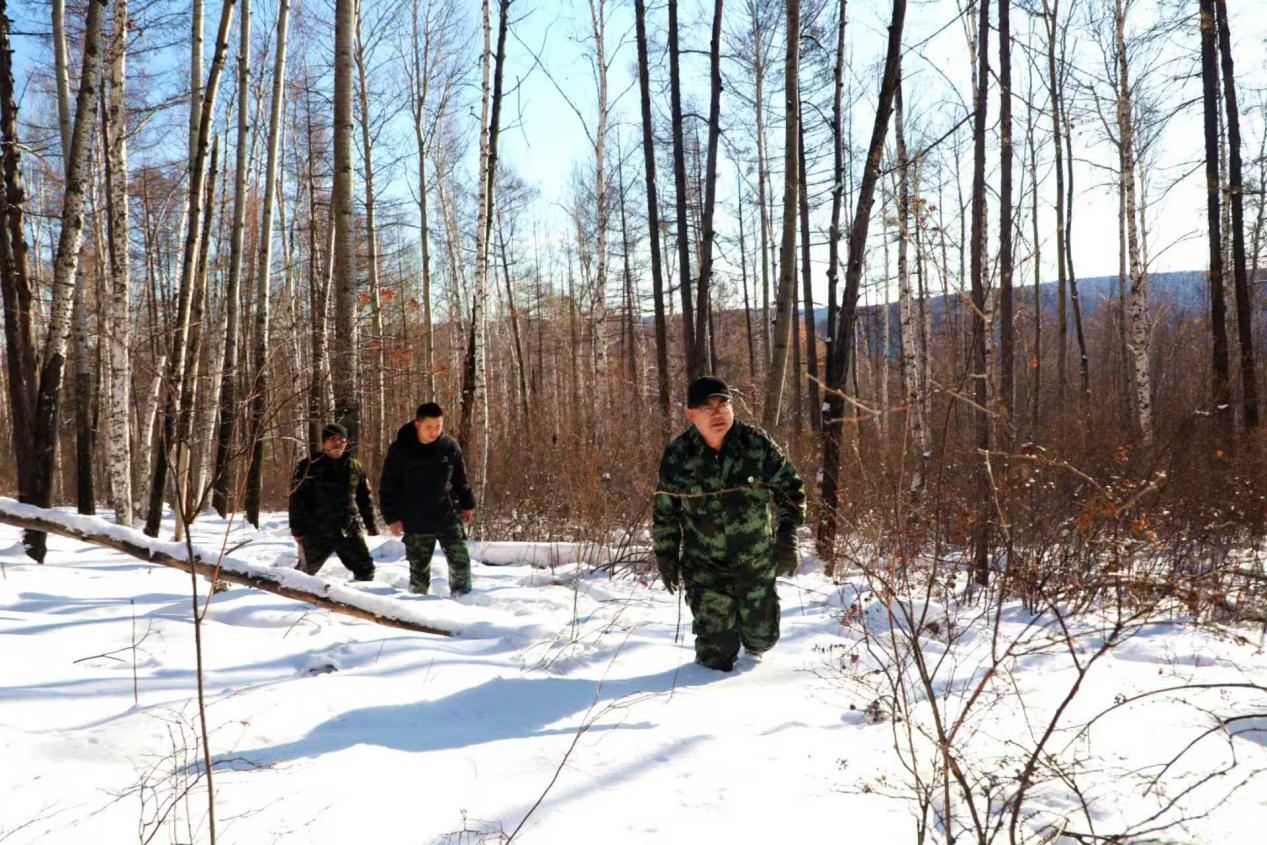 阿木爾林業(yè)局產(chǎn)業(yè)發(fā)展科工作人員踏雪前往1—0干線樺樹汁采集地塊,進(jìn)行踏查(王力 攝)