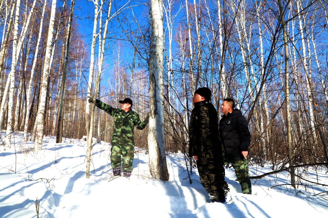 阿木爾林業(yè)局產(chǎn)業(yè)發(fā)展科工作人員在樺樹汁采集地塊,實地了解樺樹胸徑等情況(王力 攝)