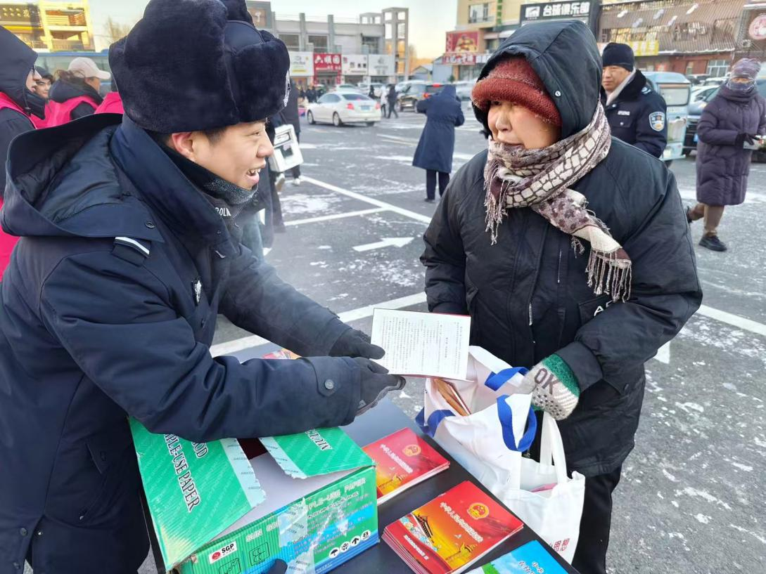 冰天雪地中,民輔警搓著凍紅的雙手仍微笑宣講,逐份發(fā)放《中華人民共和國憲法》讀本、法治折頁與防范指南?!斑@么冷的天還出來送法律知識,這些知識很實用,拿回去也讓家里人學(xué)學(xué)”,市民李大爺?shù)母锌莱隽巳罕娦穆暎F(xiàn)場咨詢、聆聽的群眾絡(luò)繹不絕,秩序井然。