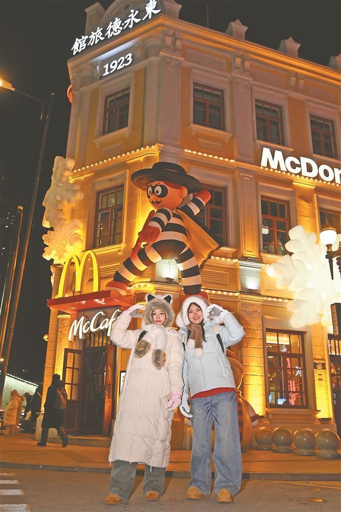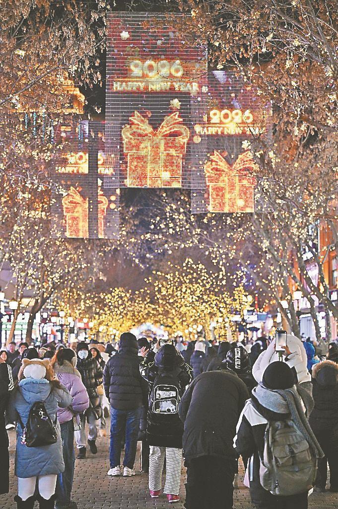 哈爾濱中央大街化身光影盛宴與煙火市集。以“瑞馬迎新”為主題的創(chuàng)意燈飾點亮了這條百年老街,動態(tài)飛馬踏星而行的造型靈動逼真,“馬上鴻運”樹燈牌流光溢彩,與街區(qū)內(nèi)的歐式建筑輪廓交相輝映,勾勒出一幅夢幻的冬日夜景。面包石鋪就的街道上人潮涌動,來自五湖四海的人們肩并肩、手牽手,共赴這場跨年之約。