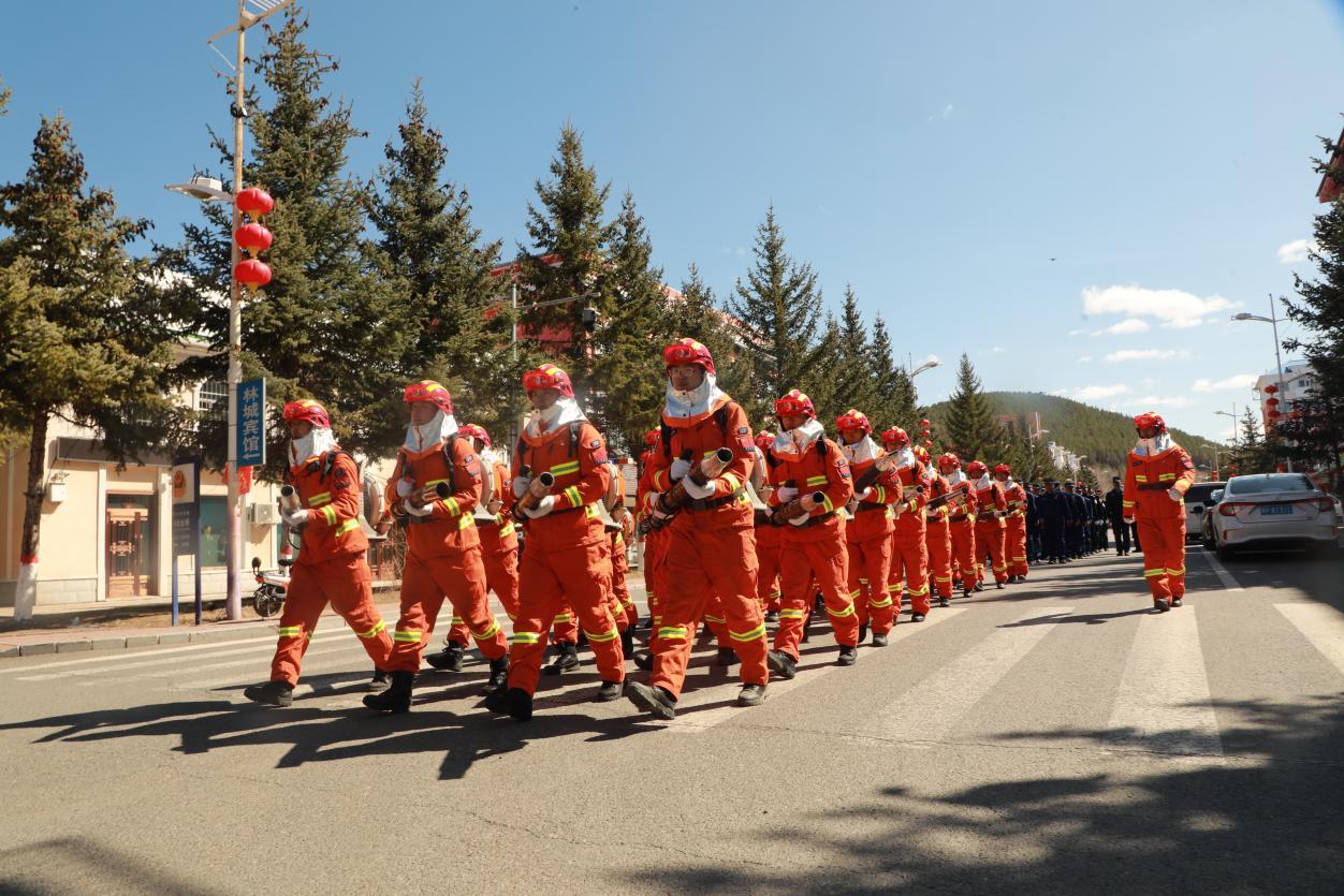 阿木爾林業(yè)局專業(yè)撲火隊(duì)員方隊(duì)徒步宣傳“五·六”森林火災(zāi)的慘痛教訓(xùn),提醒居民身在林區(qū)防火第一(王力 攝)