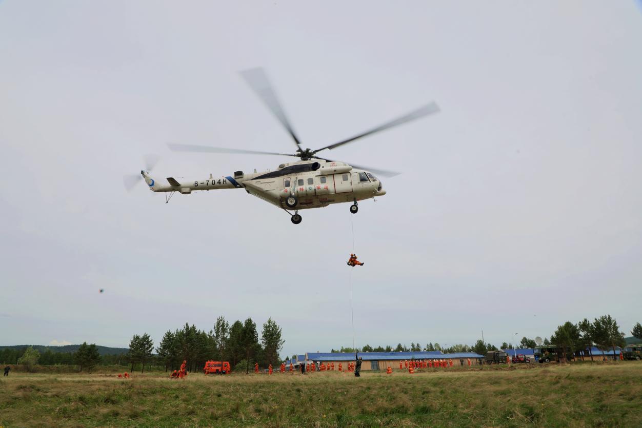 阿木爾林業(yè)局快速出擊小分隊(duì)隊(duì)員利用森林消防直升機(jī)滑降到“火情”指定地點(diǎn)(王力 攝)