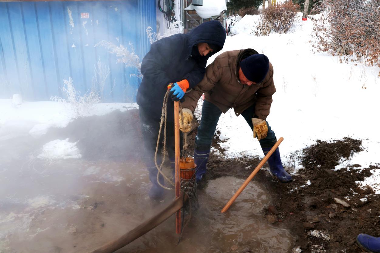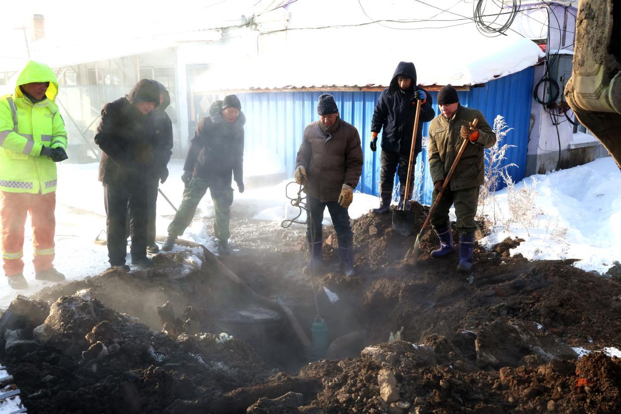 當(dāng)日早8時(shí)許,物業(yè)公司巡線員巡查時(shí)發(fā)現(xiàn)西華路平房區(qū)地面冒熱水,立即上報(bào)并啟動搶修預(yù)案。7名搶修人員火速趕赴現(xiàn)場,現(xiàn)場分工明確、緊張有序,有的安裝水泵排水,有的接駁應(yīng)急電源,有的揮鎬刨挖凍土層,同時(shí)調(diào)配小型挖溝機(jī)輔助作業(yè)。