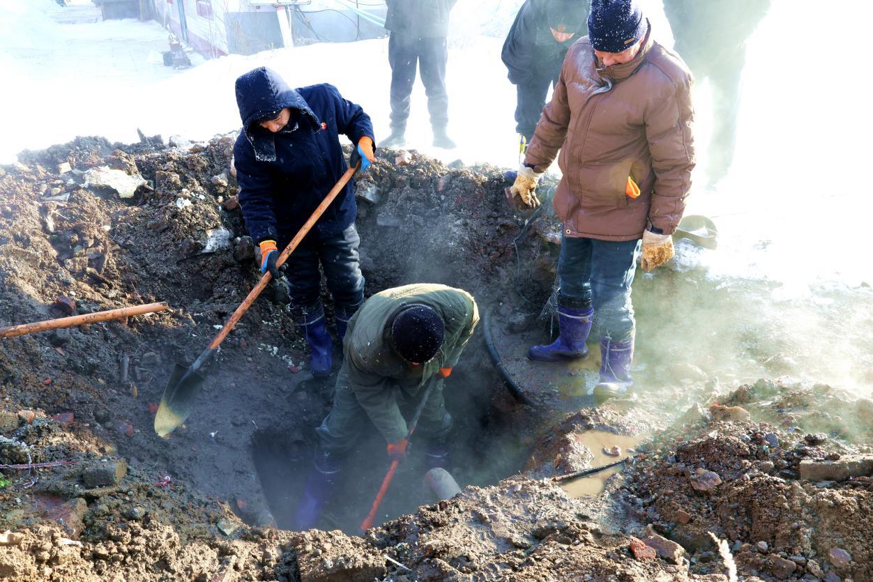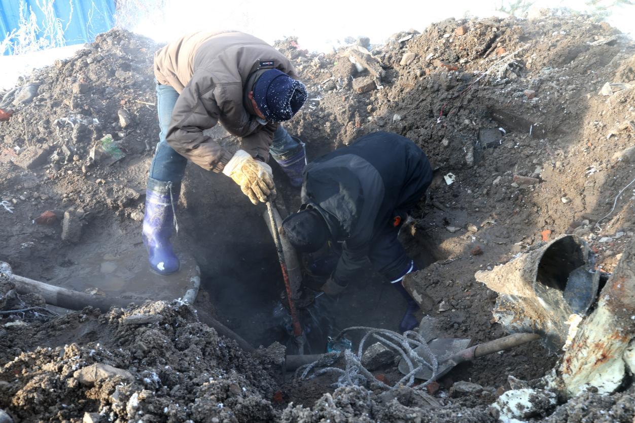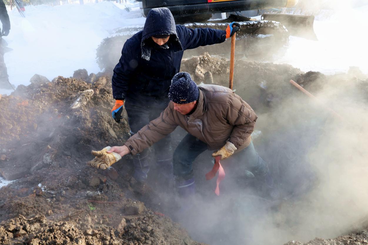 因地下管線錯綜復(fù)雜,且極寒天氣易導(dǎo)致管道凍裂,搶修人員采取邊供暖、邊排水、邊人工開挖的方式推進(jìn)作業(yè),防止管線被凍擴(kuò)大輻射面。地面破開后熱水持續(xù)涌出,搶修人員輪番上陣,清理凍土、排查漏點(diǎn),歷經(jīng)3小時(shí)奮戰(zhàn),至11時(shí)40分挖出1.8立方米深坑,精準(zhǔn)定位漏點(diǎn)為供暖分線軟接頭老化,此時(shí)跑水量已達(dá)每小時(shí)4噸。為控制漏損,搶修人員當(dāng)即關(guān)閉分線閥門,受此影響,周邊20余戶居民供暖暫時(shí)中斷。