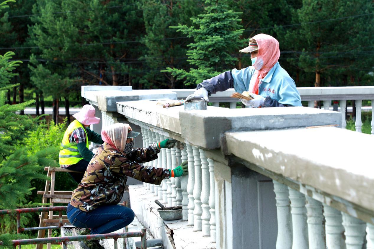 阿木爾林業(yè)局職工在修補(bǔ)北極冰藍(lán)莓酒莊護(hù)欄(王力 攝)