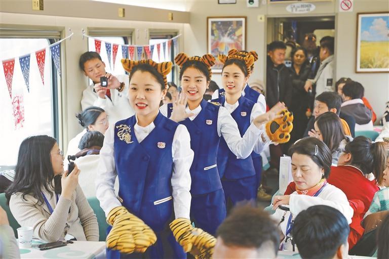 工作人員在旅游列車上表演“萌虎韻律操”。邢玉博攝