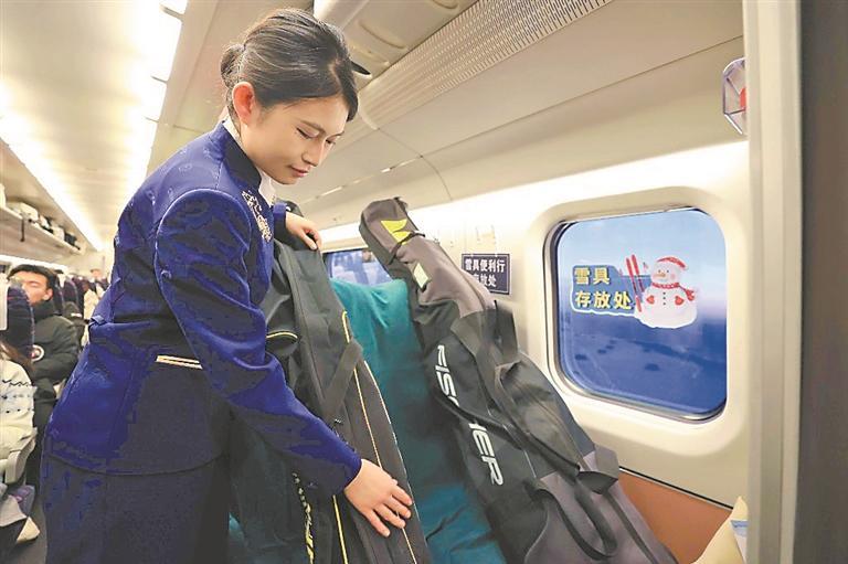 實行雪具便利行服務,雪具在動車組上也有了專屬“座位”。徐率攝