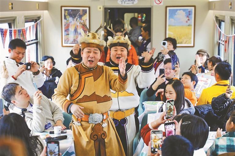 2月5日18時20分,K7041次“東北大花”主題列車從哈爾濱站緩緩駛出,一路向北,駛向漠河。車廂內(nèi),來自大興安嶺的鄂倫春族非遺代表性傳承人,現(xiàn)場展示用樺樹皮制作的手工藝品,列車工作人員身著民俗服飾帶領游客剪窗花,東北秧歌、二人轉(zhuǎn)表演更是點燃了旅途熱情。